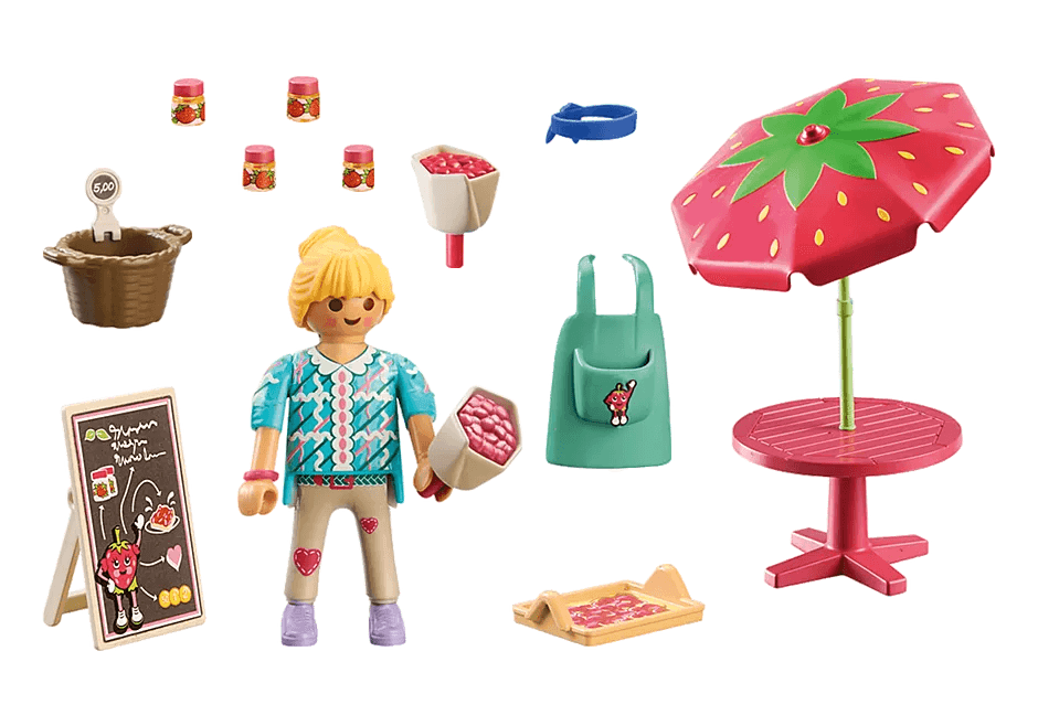 Discover the PLAYMOBIL “Jam Seller” box set! Visit the stand and taste the sweetness of freshly picked strawberries. Don't miss the delicious strawberry cake and tangy strawberry jam. This set includes a PLAYMOBIL character, a table, a sign, a handle bag filled with fresh strawberry inserts, jam jars and accessories. The saleswoman's hairband, bracelet and apron can be removed. The new Ferme range is made with more than 80% recycled or biosourced materials on average.