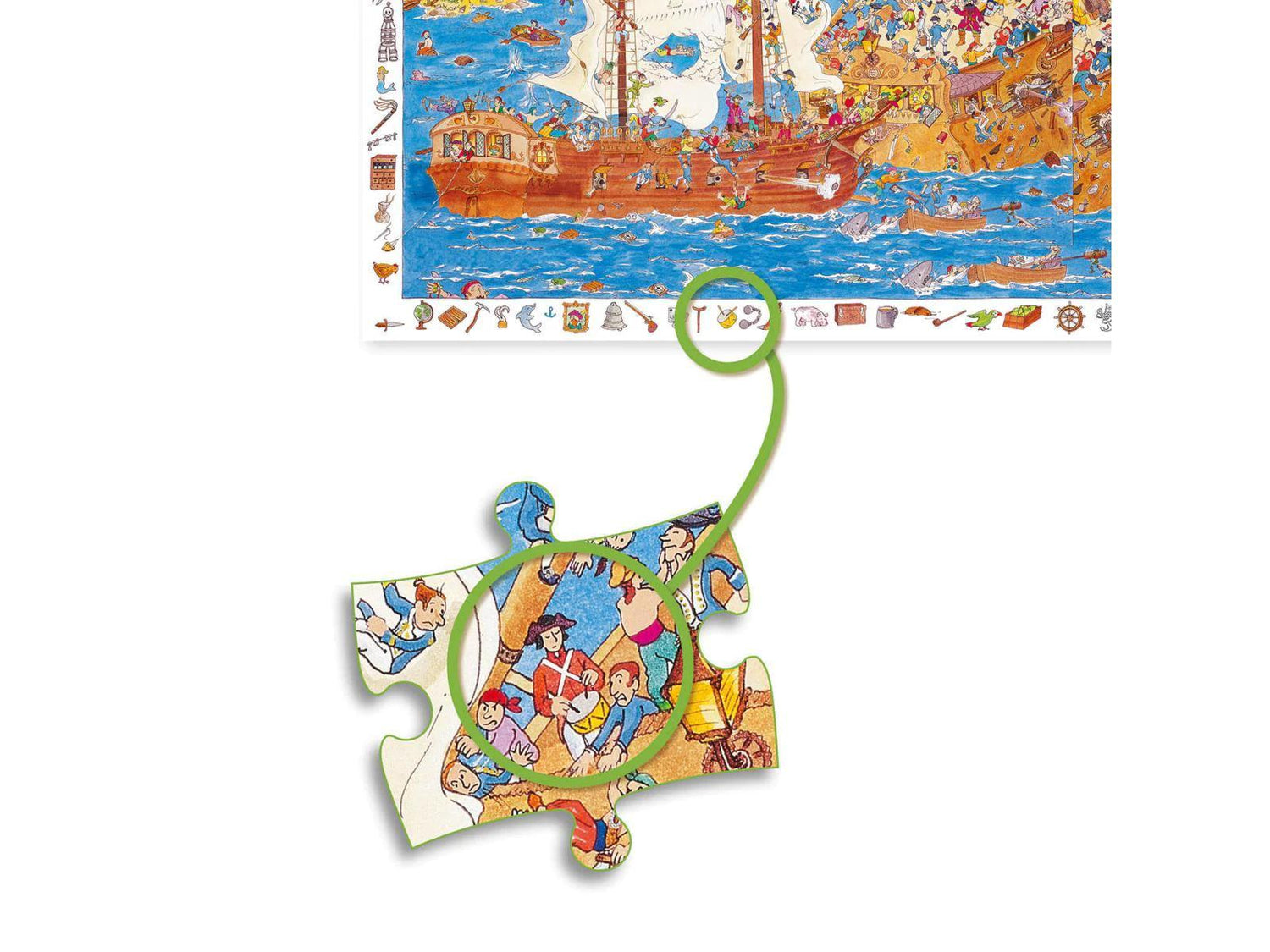 Pirates - 100 pieces - Around a large picture, dozens of subjects or objects to discover! Start by assembling the puzzle pieces, then have fun finding the elements of the frieze in the central image.