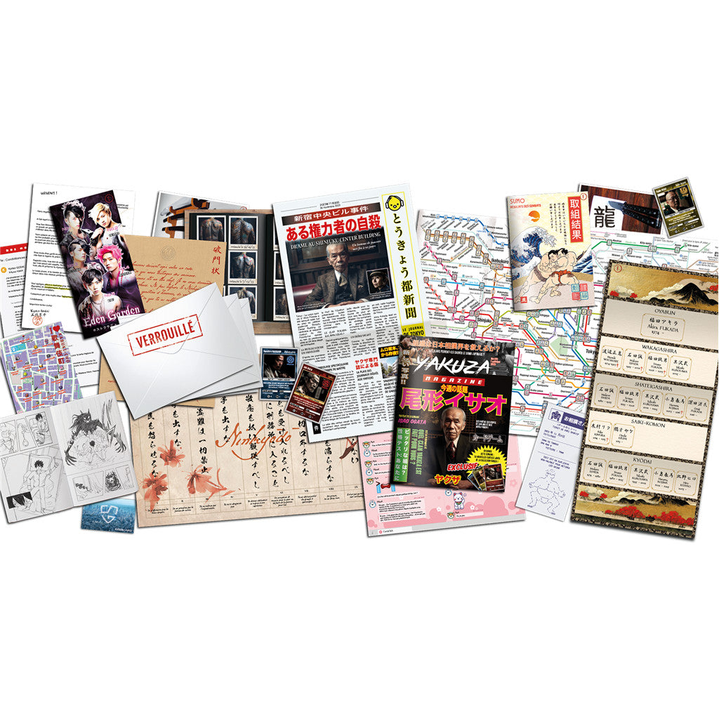 A COMPLETE CRIMINAL FILE: Includes a map of the Tokyo metro, a manga, a magazine on the Yakuza, a newspaper article, photos of tattoos, audio content...