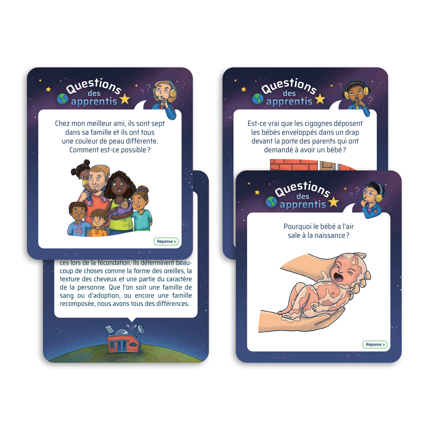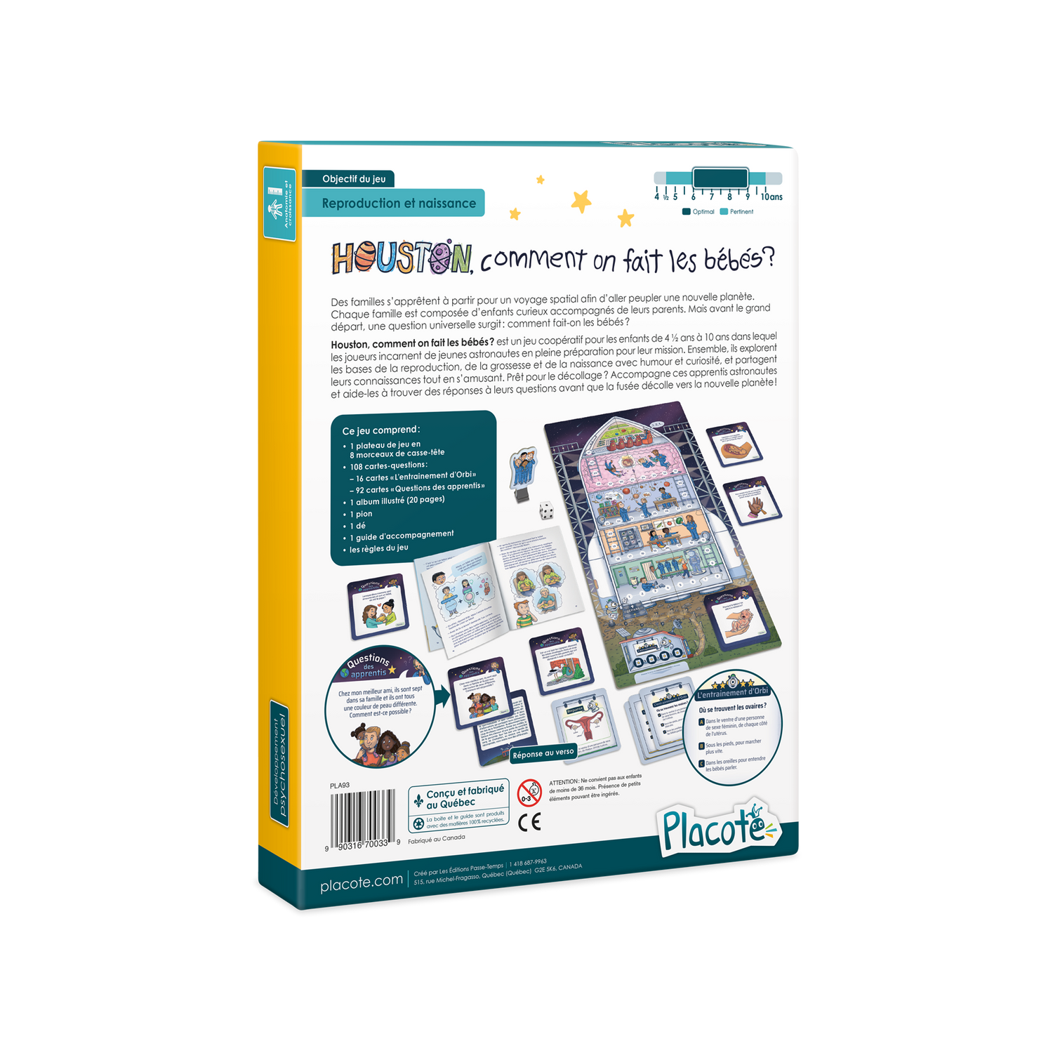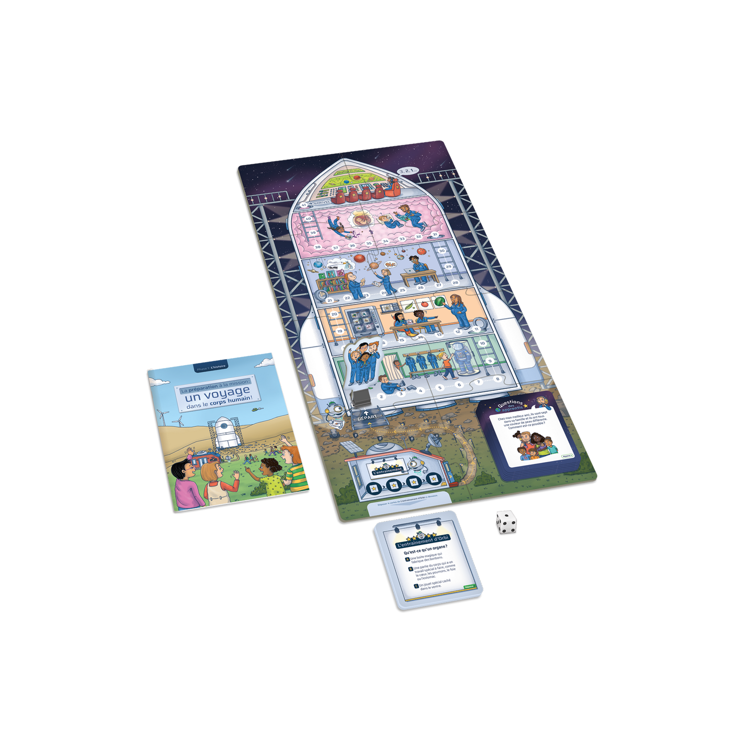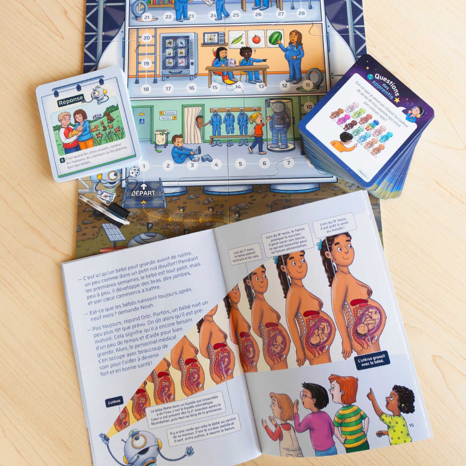 Houston, comment on fait les bébés? is a cooperative game for children aged 4½ to 10 in which players take on the role of young astronauts preparing for their mission. Together, they explore the basics of reproduction, pregnancy and birth with humor and curiosity, sharing their knowledge while having fun. Ready for take-off? Accompany these apprentice astronauts and help them find answers to their questions before the rocket takes off for the new planet!