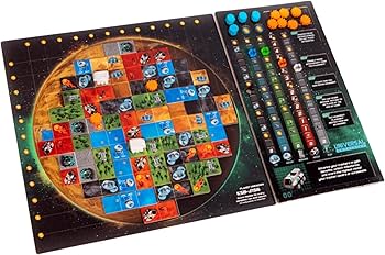 Each turn, draft and place a tile featuring two of the six terrains that represent the infrastructure needed to support life on the planet. Use them to develop your resource tracks and complete as many rows and columns on your planet as possible to score victory points.