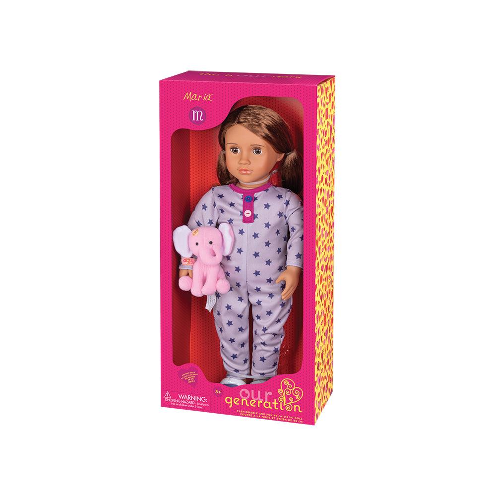 Includes: 1 non-articulated 46 cm doll, 1 onesie, 1 pair of underwear, 1 pair of slippers and 1 elephant soft toy.