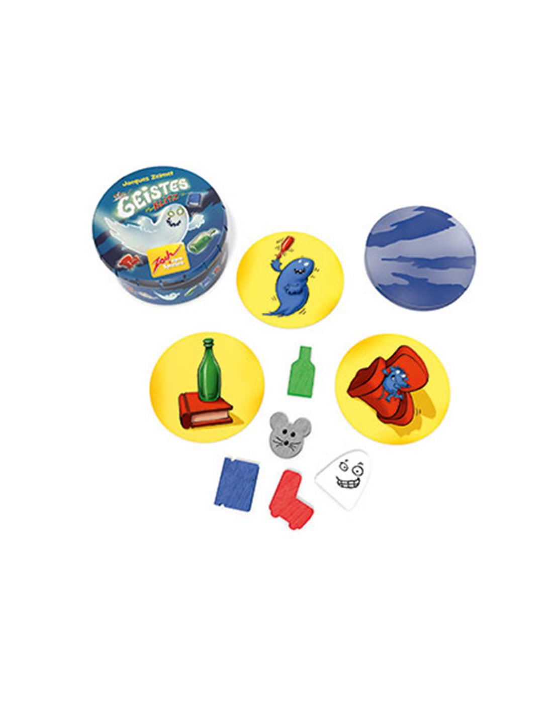 5 objects to catch are placed on the table. The game cards show images of two objects, with one or two of the wrong color. With all players playing at the same time, one of them turns over a card, and all try to catch the right object - but which one is it?