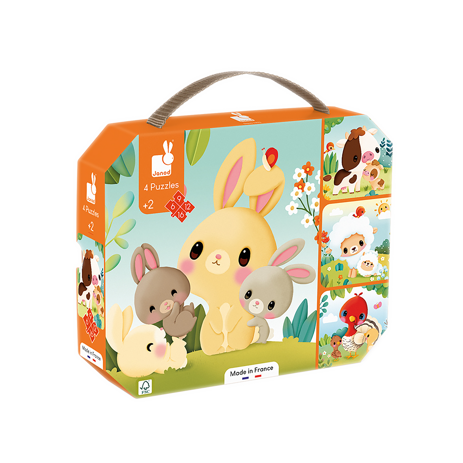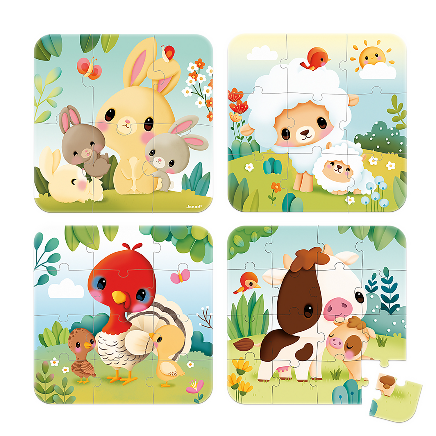 Four dinosaur-themed cardboard puzzles. Each puzzle has a different color on the back to help children find the right pieces. The puzzles also have an evolving number of pieces to help children progress: 6, 9, 12 and 16 pieces.