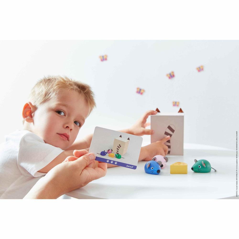 A fun way to learn about nursery school - that's the promise of this great wooden educational game! It will help the little ones to understand their bearings in space and expand their vocabulary! It's off to the races between the cat and the mice! 3 different-coloured wooden mice, a piece of cheese and a cat (symbolised by the box) are waiting for children aged 3 and over to play together. Using the 12 double-sided model cards, little ones will have to reproduce a scene and at the same time acquire the associated vocabulary: in front of/behind, above/below, on/in, inside, next to, between, etc. They will also develop their sense of observation. There are 3 levels of difficulty, represented by colours on the cards. As the game progresses, children can go from 2 elements to place to 6. This game can be used as an independent workshop, or in pairs with an adult describing the scene, which the child can then reproduce to develop their listening comprehension skills. What's more, this wooden educational game is really pretty! Children will love discovering and handling these adorable little mice and their cheese, and playing hide-and-seek with the cat! An instruction leaflet explains how best to use this game, which is designed for children in nursery school.
