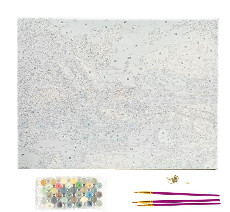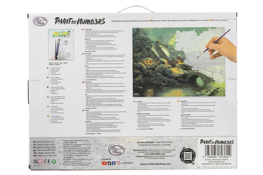 This Thomas Kinkade "Christmas Moonlight" Paint by Number kit contains all the necessary supplies: