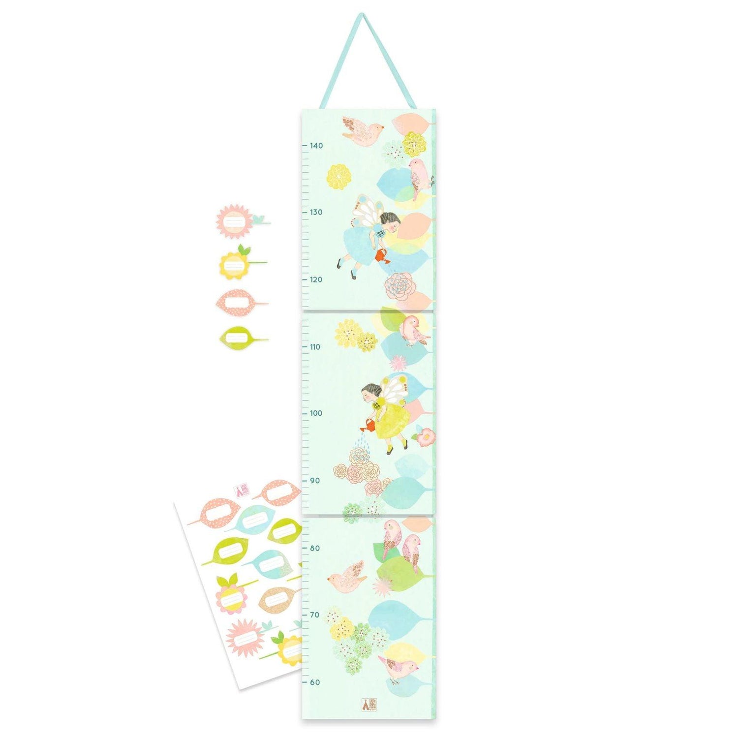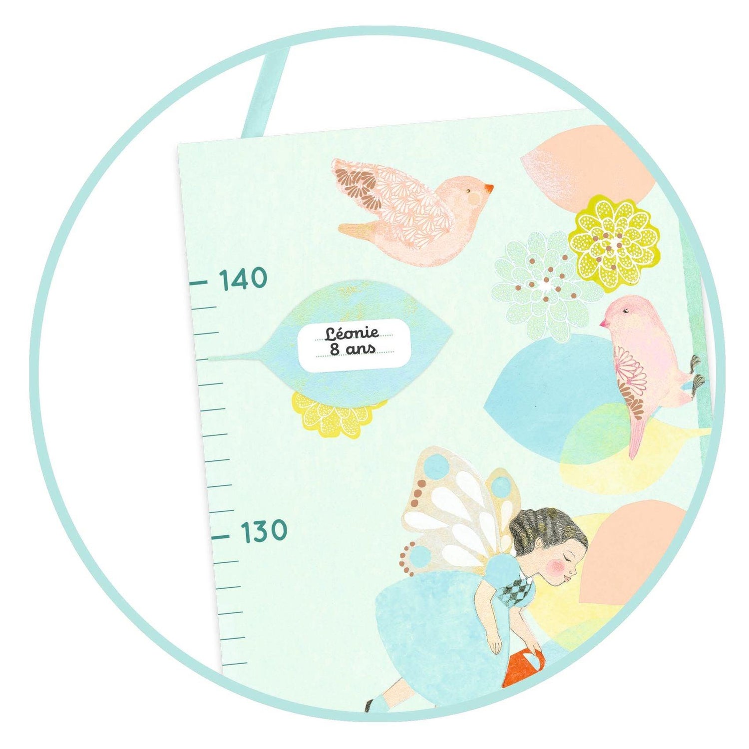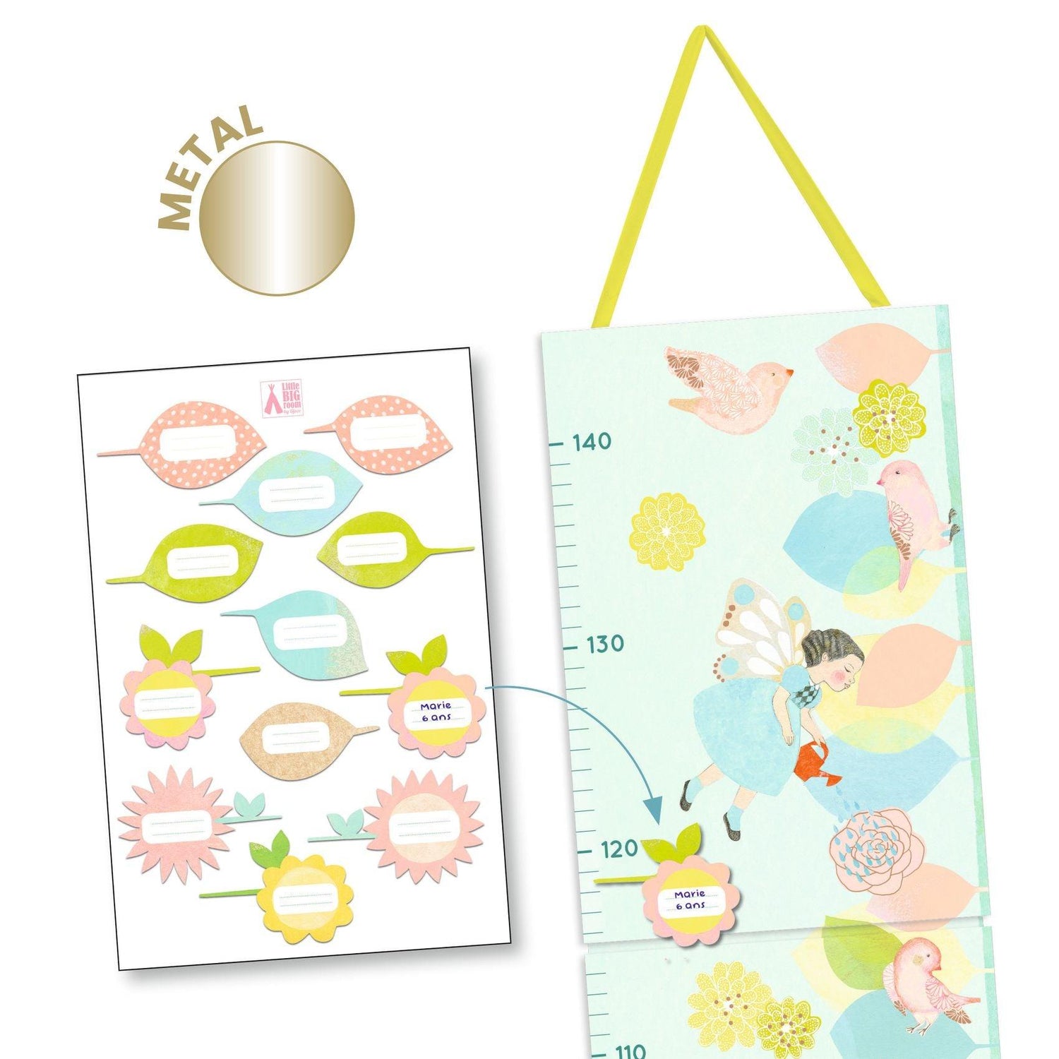 A large wall chart with many repositionable "flower" stickers with spring illustrations. A beautiful decorative object ideal for measuring children over time (up to 1.40 m). And when the child is big, we put it away in its pretty box for a tender memory.