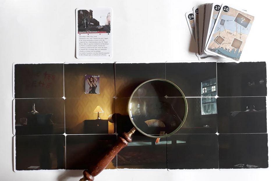 The crime scene is spread across multiple cards to form a large illustration. To investigate, it's simple. Take a card to examine it closely. Does something intrigue you? Flip the card over and discover what that small piece of paper on the bedside table is.
