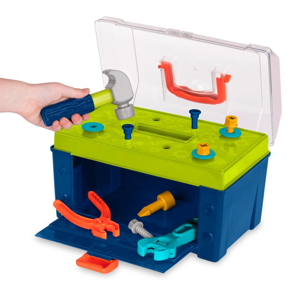 - Includes 20 pieces: 1 tool chest, 1 tray, 1 drill, 1 hammer, 1 wrench, 1 pair of pliers, 1 measuring tape, 4 nuts, 4 bolts, 2 nails, 3 drill bits.