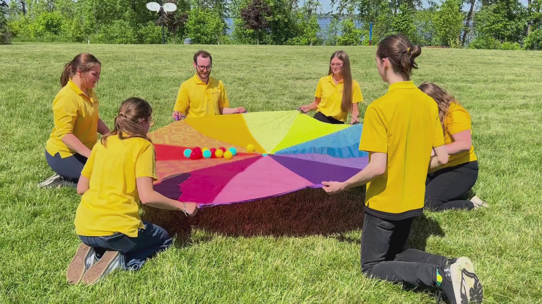 Put the 15 brightly colored balls into the parachute and do your best to avoid dropping them.