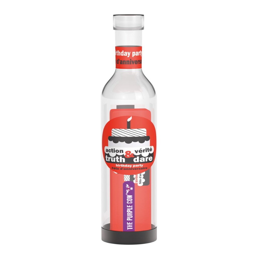 Choose a player who starts by spinning the bottle. Once the bottle stops, this player draws a card and asks the person opposite the neck of the bottle: "Truth or Dare?