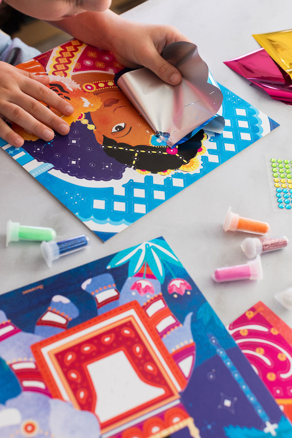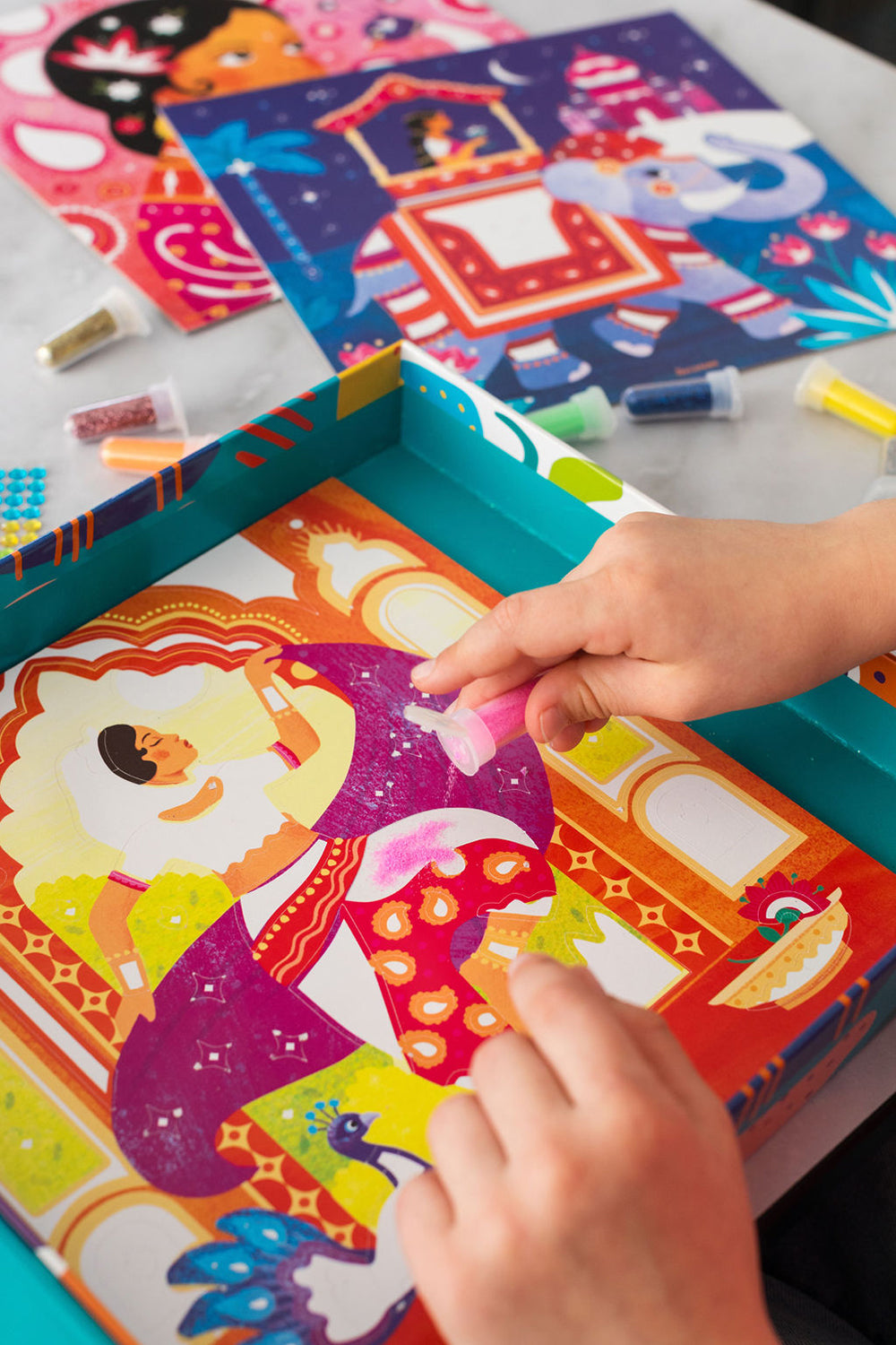 5 self-adhesive boards to decorate with sand (8 tubes) and metallic foil, 1 spatula and 1 booklet with templates and instructions.