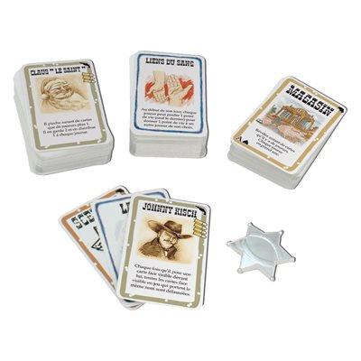 "The Outlaws hunt the Sheriff. The Sheriff hunts the Outlaws. The Renegade plots secretly, ready to take one side or the other. Bullets fly. Who among the gunmen is a Deputy, ready to sacrifice himself for the Sheriff? And who is a merciless Outlaw, willing to kill him? If you want to find out, just draw (your cards)!" The card game BANG! recreates an old-fashioned spaghetti western shoot-out, with each player randomly receiving a Character card to determine special abilities, and a secret Role card to determine their goal. This version includes the base game and 3 expansions!