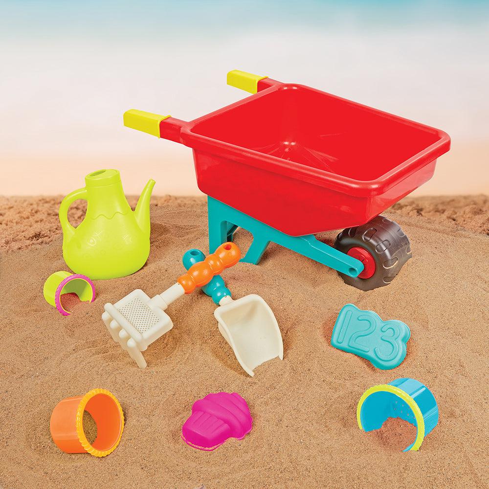 - Roll, dig, build and play on sunny days with a bright red wheelbarrow and colorful sand toys!