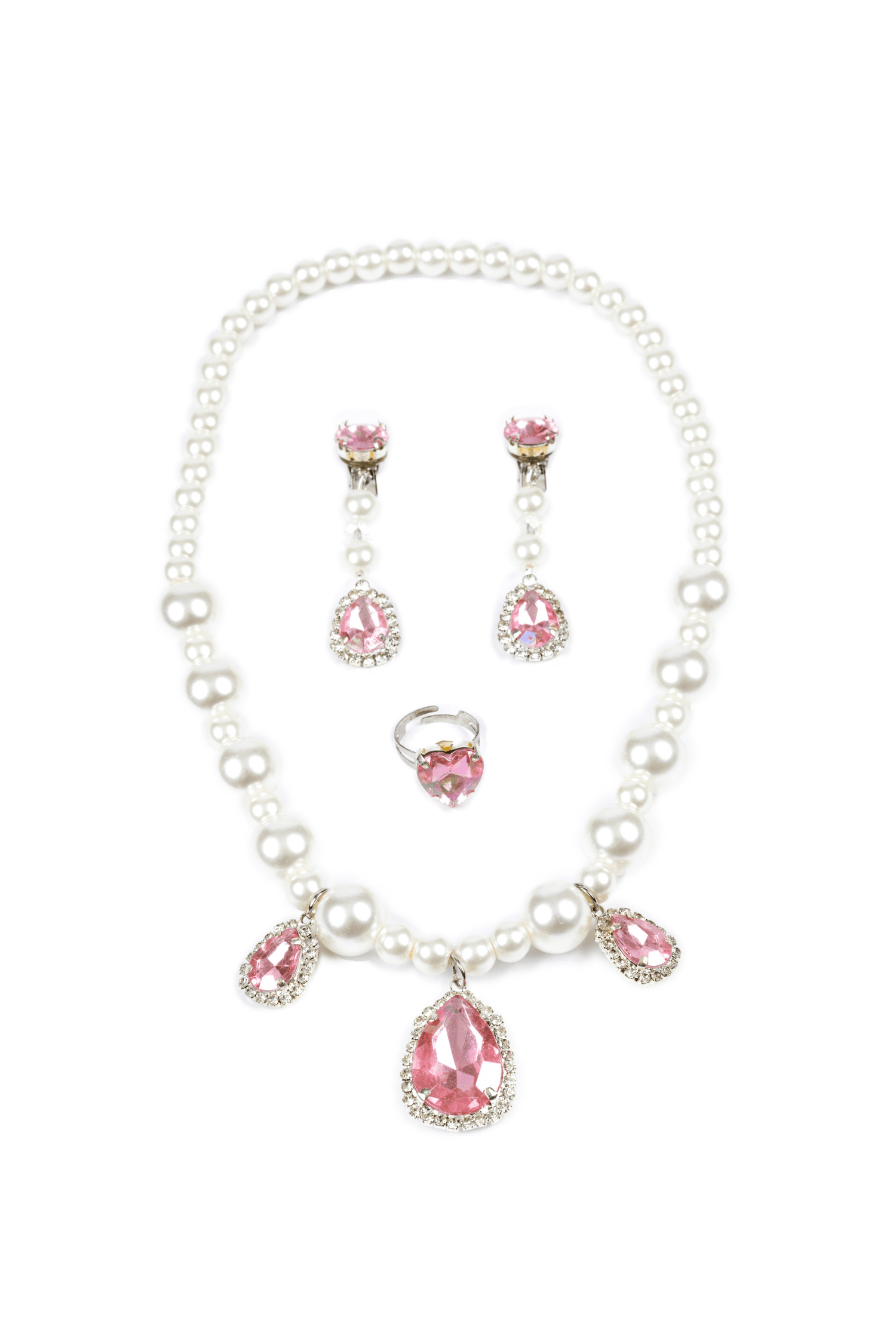 Bold pink gemstones combine with soft, elegant pearls in the Le Coco 4-piece jewellery set. This beautiful set includes dangling clip earrings, a heart-shaped ring and a matching pearl necklace with teardrop charms.