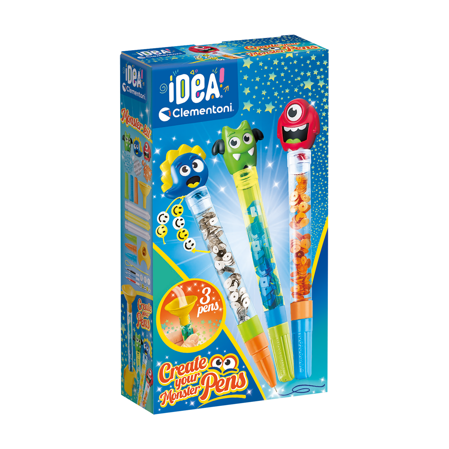 An original creative box that lets you assemble 3 pens and personalize them with different monster-themed decorations.
