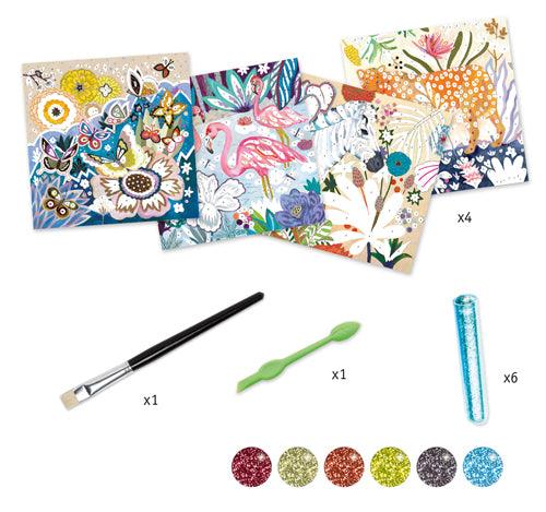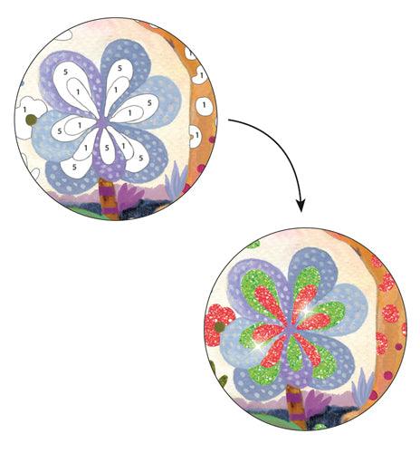 With a small tool, we peel off areas in the image. Under these areas, sticky parts where glitter is applied. A thin layer of glitter sticks to these areas and the images light up like magic.