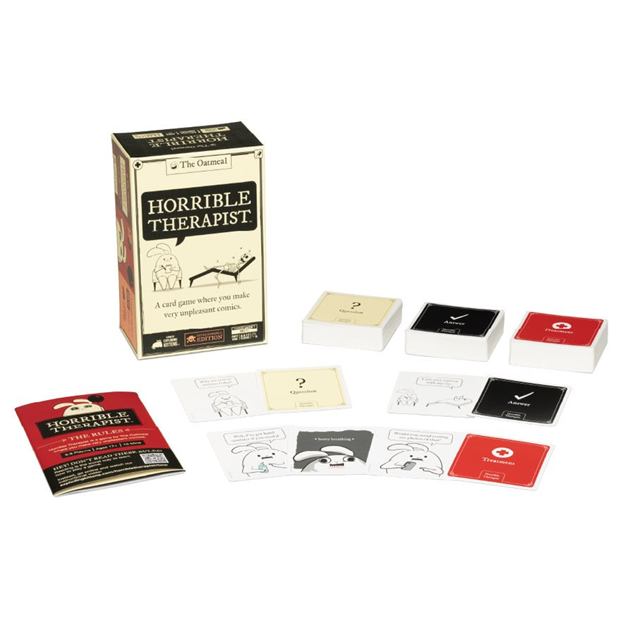 In this card game for adults, you create a therapy comic strip with a question, an answer and a treatment. The player with the funniest Treatment card wins a point. The first to reach 3 points wins. It's a fun, hysterical addition to your collection of party card games.