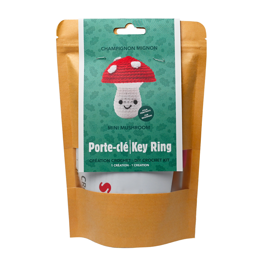 An adorable and affordable crochet kit for creating a mushroom-shaped keyring. Perfect for workshops, gift sets, or creative hobbies.