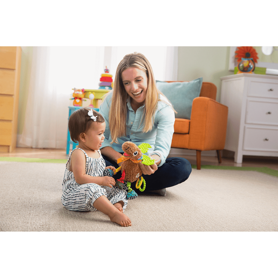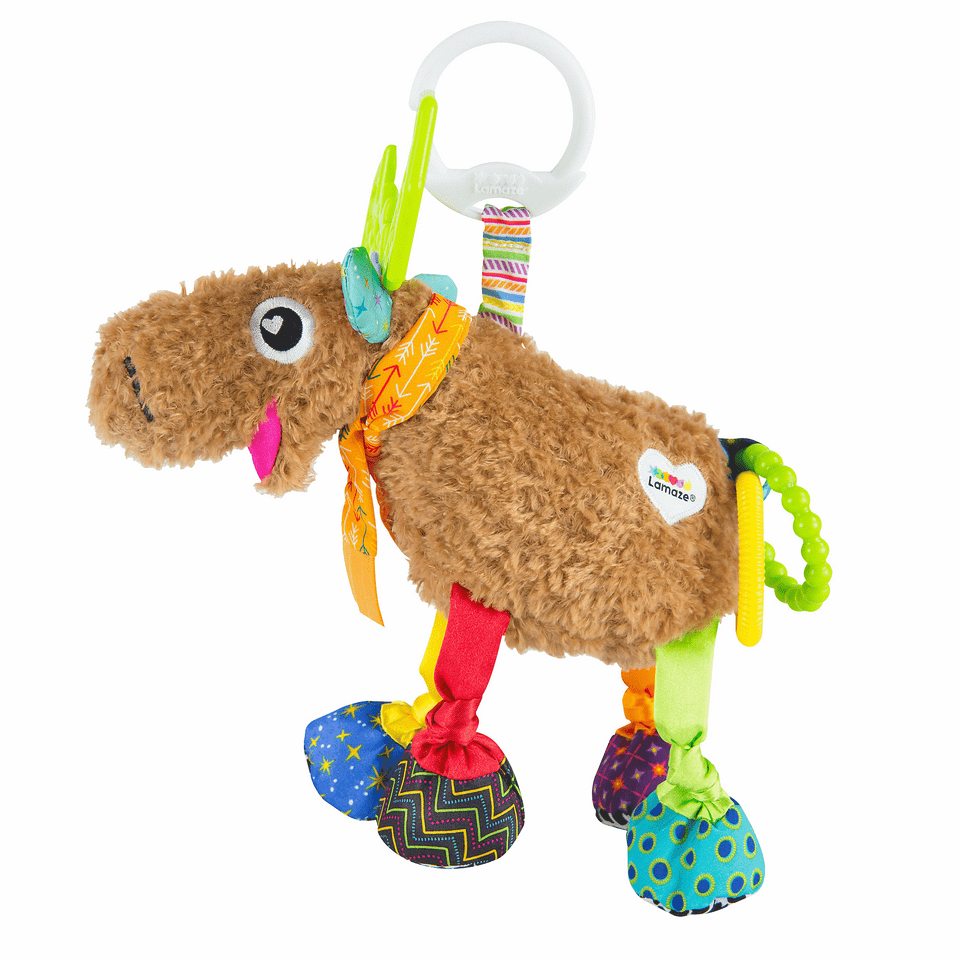 Mortimer the moose is a developmental toy that offers lots of fun for your toddler to explore. Mortimer has colorful, satiny, gnarly legs and multiple textures on his hooves with fun folds and jingles. Squeeze his belly to show baby how he squeaks! Mortimer also features contrasting patterns and multiple bright colors that help visual development during playtime. Babies explore using both hands and mouth, and Mortimer's antlers are perfect for chewing! The Lamaze on-the-go clip lets you attach this cute baby toy to strollers, carriers and diaper bags for fun wherever you go.