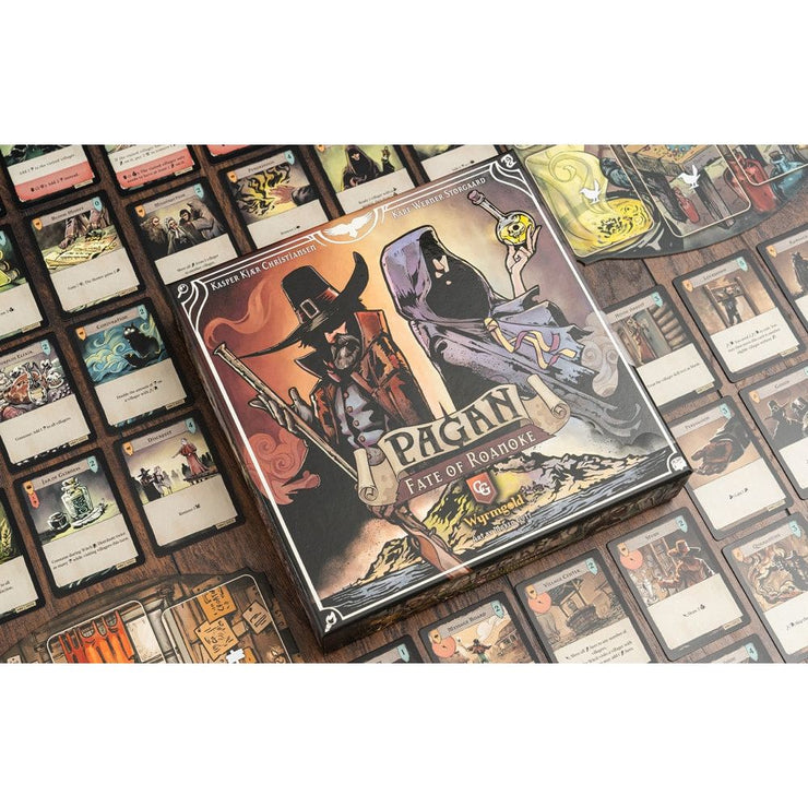 Pagan: The Fate of Roanoke is an expandable, asymmetrical card game in which one player assumes the role of the witch and the other that of the witch hunter. The witch attempts to carry out a renaturation ritual before being unmasked and eliminated by the witch hunter.