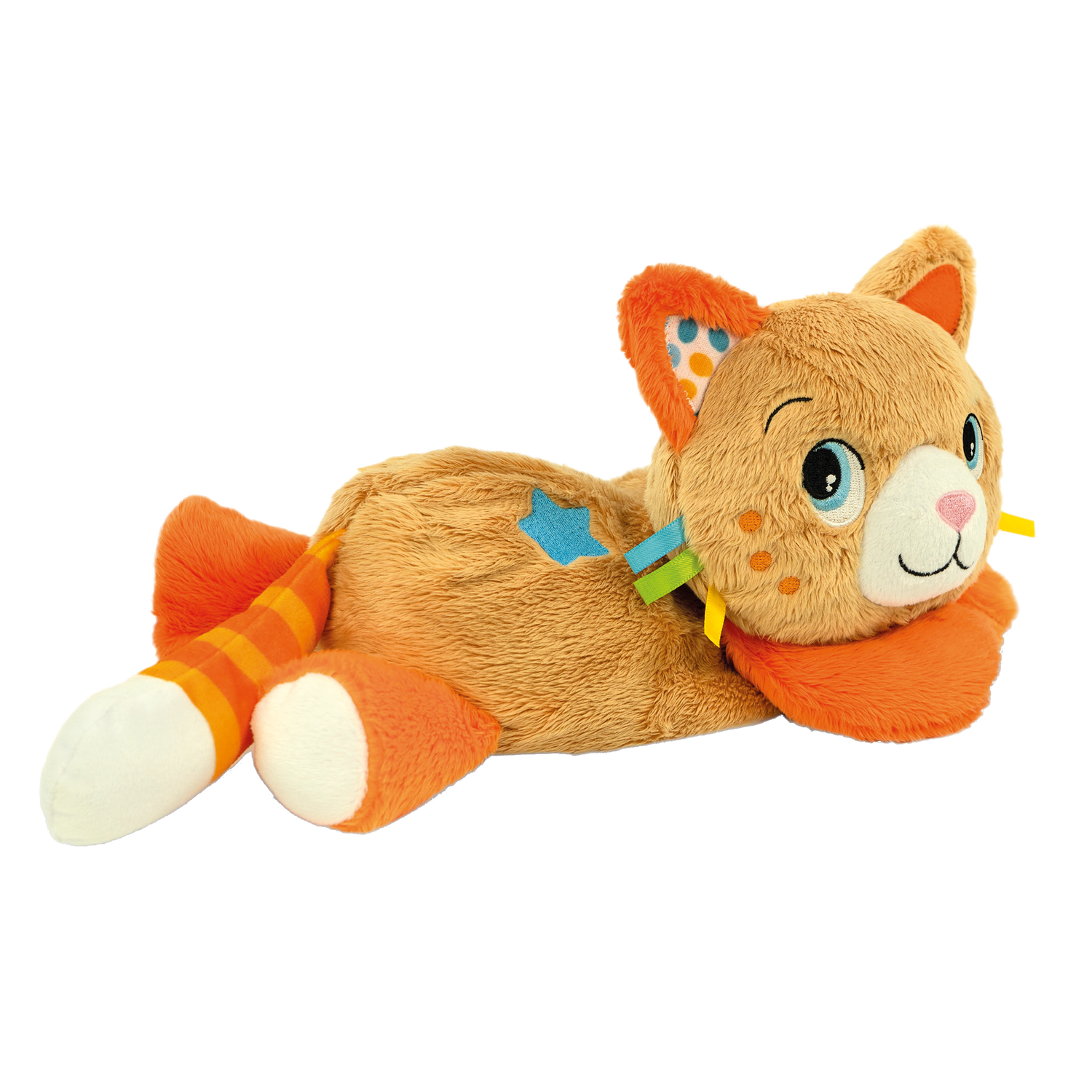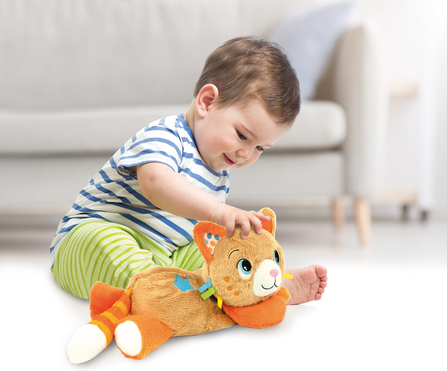 A soft plush kitten, ideal for calming children and getting them ready for bedtime. The toy features a special vibration that imitates a cat's purr and, combined with gentle melodies, calms children and helps them fall asleep. The cat also reproduces a white noise that soothes the child during the relaxation period preceding sleep. The plush can be machine-washed after removing its electronic module.