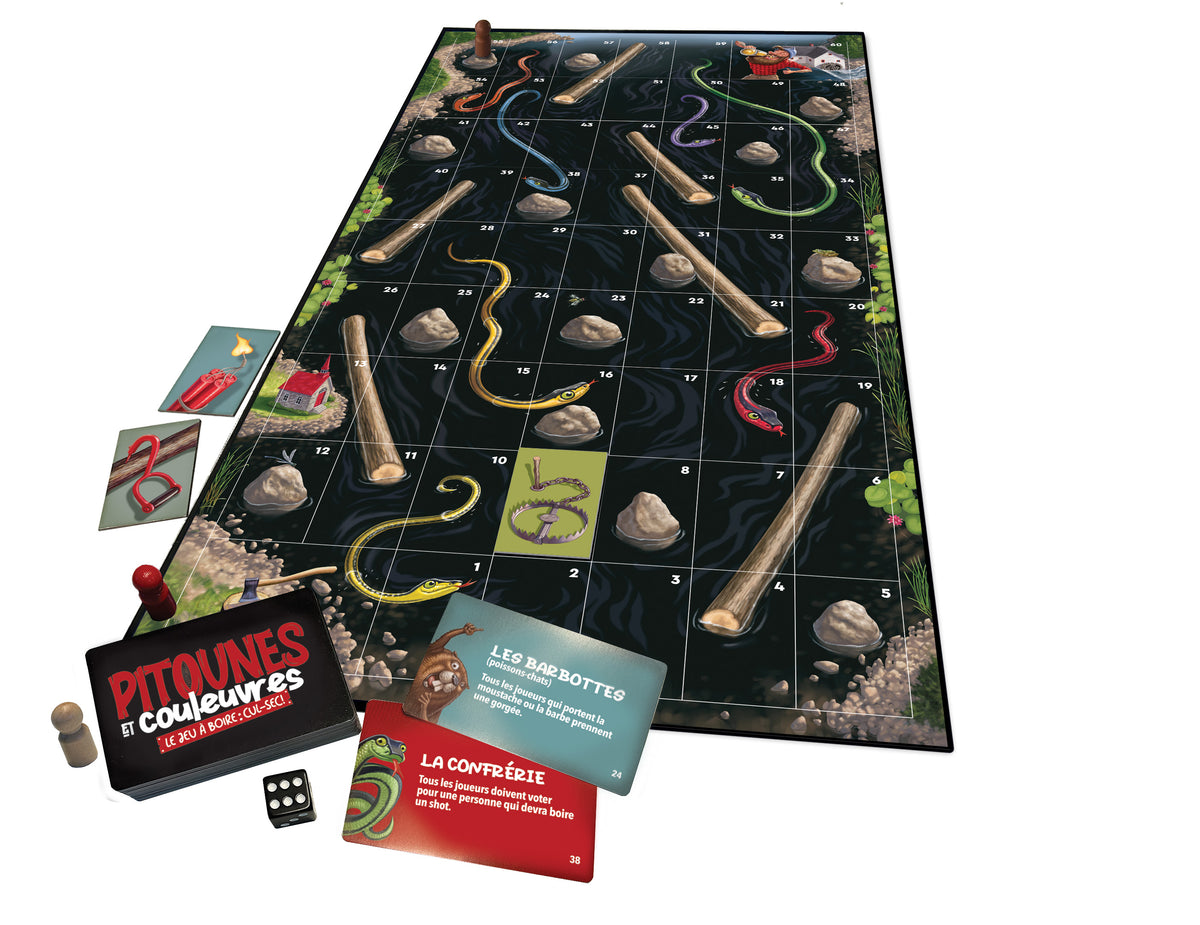 Contents: 1 game board, 54 Pitounes and Couleuvres cards, 3 tiles (1 dynamite, 1 trap, 1 hook), 6 wooden counters, 1 set of rules, 1 dice)