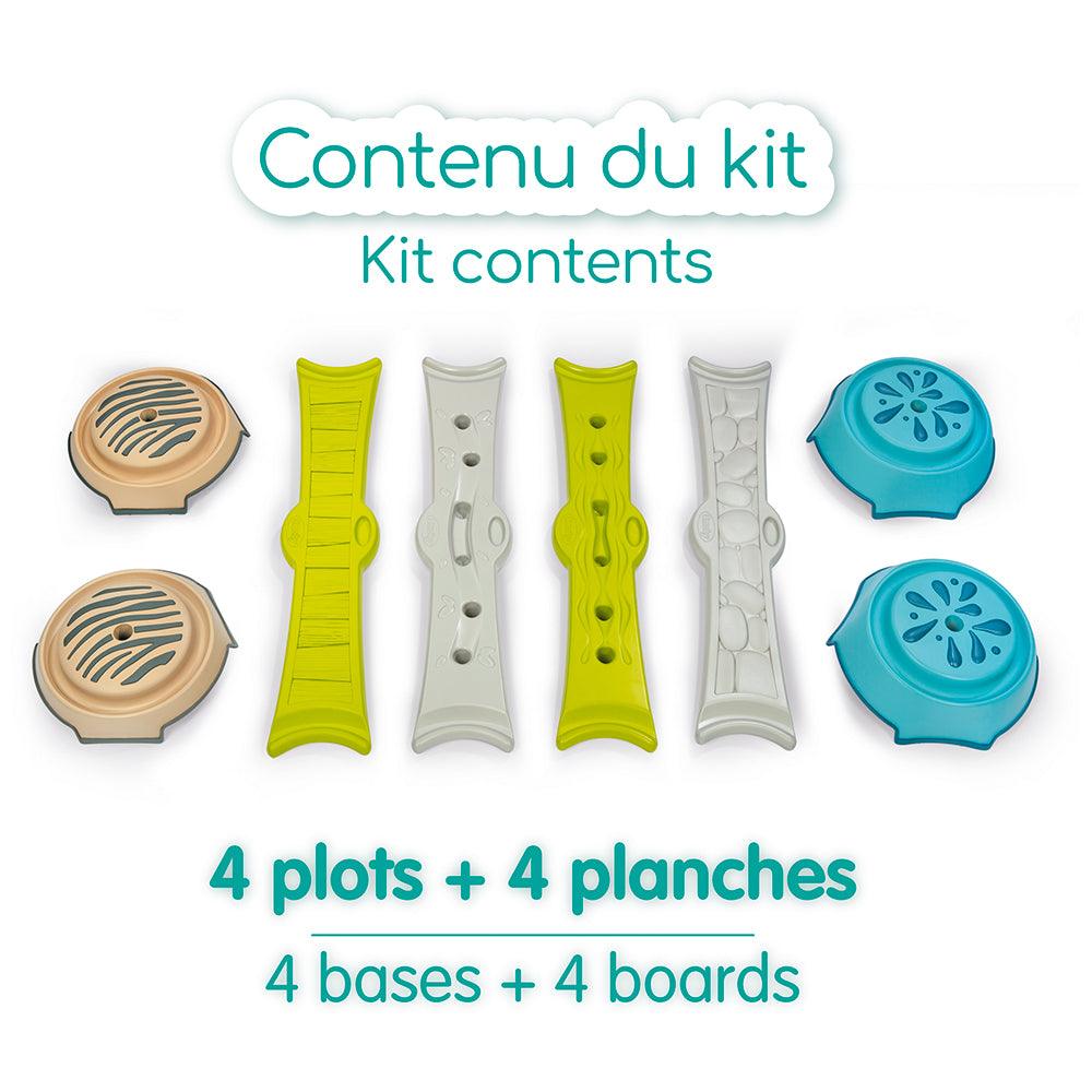 With the motor skills course your children will be able to stimulate their motor functions and develop their balance, their coordination, their sensory awareness... Made up of 4 blocks and 4 boards, the course is perfectly modular and intuitive. It will allow you to assemble the elements as you wish, and promises infinite configurations! You can use the course indoors and outdoors. It is UV and weather resistant. The boards, made of blown plastic, guarantee robustness and safety! As for the pedestals, they have an anti-slip surface, so you can walk on them in complete safety. Once the game is finished, you can easily store the elements in their transport box. The course measures up to approximately 3.5m in length (maximum). Maximum user weight: 50 kg (110 lbs).