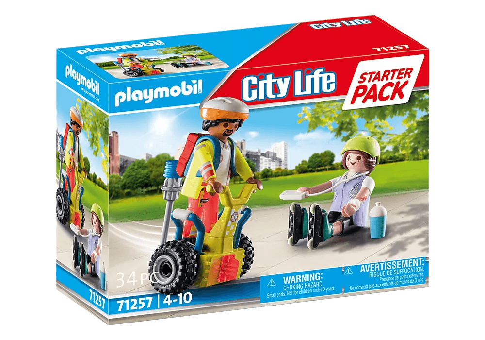 Rush to the rescue with the Balance Racer Starter Pack from PLAYMOBIL. An inline skater has fallen in the park and can no longer get up. Immediately the helpful paramedic comes to the rescue. Thanks to his agile balance racer, he is also fast on narrow paths. As soon as he reaches the injured person, he takes care of the first aid. Then it's off to the hospital for further examination. A great play experience for children aged 4 and up.