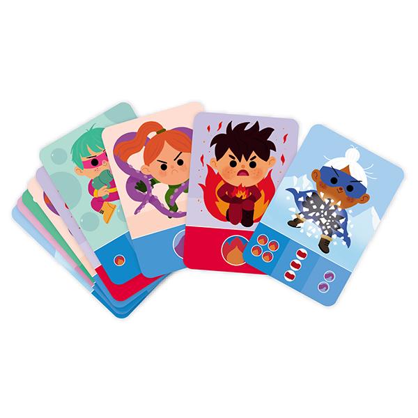There are 3 types of Villain cards: spitting fire, biting with terrible fangs or choking with tentacles. A symbol indicates the villain's characteristic. Superheroes have these same characteristics in varying quantities. Villain cards are stacked face-down, and Superhero cards are dealt to all players.