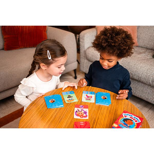 At the start of the turn, a Villain card is turned over, and all players turn over the first card in their deck at the same time. Like in a battle, whoever has the most of the required symbol on their card wins the Villain card.