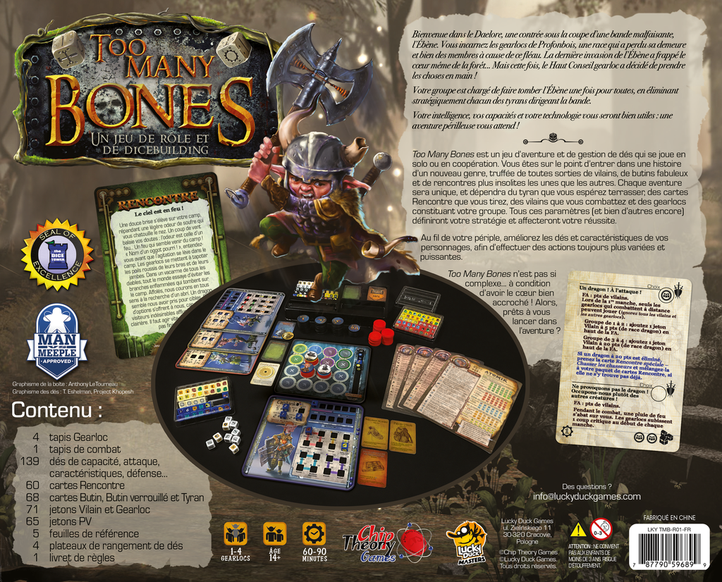 Featuring single-player and cooperative modes, Too Many Bones contains 138 custom dice, beautiful neoprene mats with stitched edges, 100% plastic cards and dozens of high-quality tokens. Each of the 4 Gearlocs has 21 custom dice, numerous evolutionary options through its own mechanics and skills.