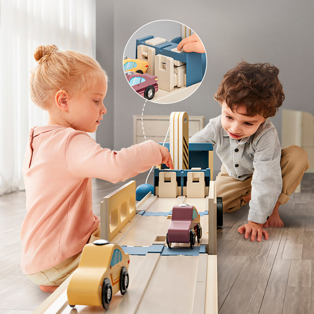 The TOPBRIGHT Roll & Race car transporter combines everything that will delight little car fans aged 36 months and over. It's not just a great car transporter, but also an exciting race track. The mobile transporter can accommodate eight toy cars on two levels. In just a few simple steps, the wooden car transporter transforms into a 103-centimeter-long, two-lane race track, inviting children to take part in fast-paced car races. Alone or with the family, children place the cars on the racetrack at the starting point, press the start button, and the cars race down the track. The car transporter stimulates children's imagination and invites them to play freely: eight cars, two race tracks, a driver, and a magnetic crane - and the car racing experience is complete. Children can be creative and invent exciting stories about the 2-in-1 car transporter. Once the game is over, the toy cars can be stored on both levels. This helps keep the child's room tidy and allows for a quick start to the next play session.