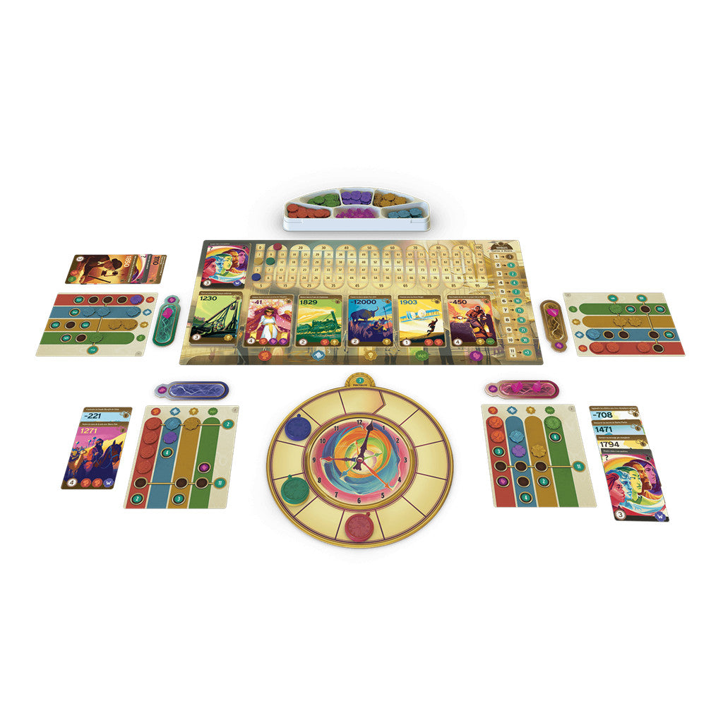 The game is divided into three rounds, each representing one day of your journey. Each day, you visit a series of historical events, spending a different number of hours at each. Each round, you choose to visit a historical event and spend a certain number of hours doing so. This will bring benefits, such as checking off items on your itinerary for points and earning time crystals so you can bend the space-time continuum on future turns. Along the way, you'll also score points for visiting historical events in chronological order.