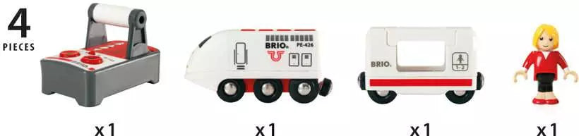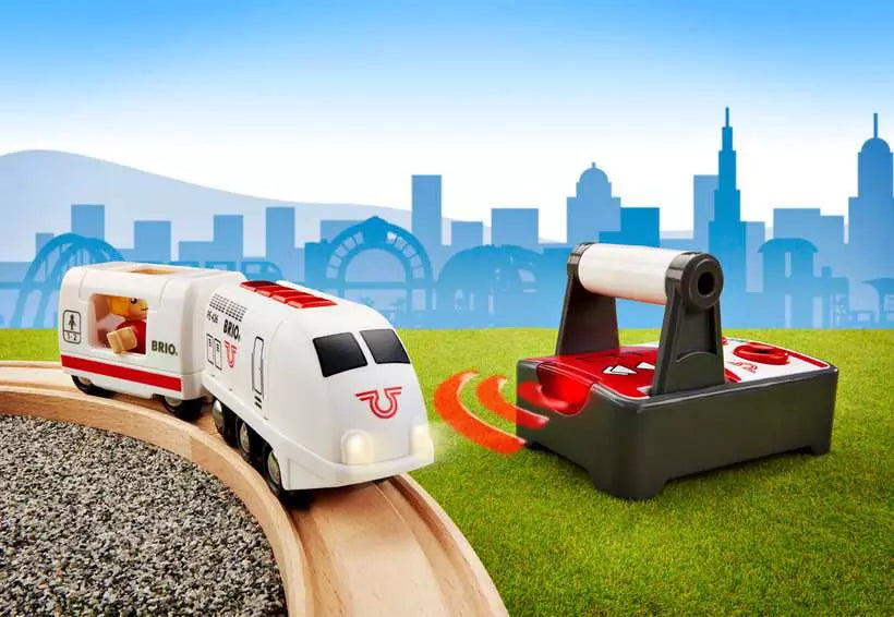 Le train de voyage télécommandé est un excellent ajout à votre circuit BRIO World, avec de l’espace supplémentaire à bord pour le passager. La télécommande, facile à utiliser, propose deux vitesses avant, des fonctions marche arrière et arrêt. Elle dispose également de boutons simples pour activer les effets lumineux et sonores du train jouet. Si vous souhaitez jouer de plus près, aucun problème : le train peut aussi être contrôlé à l’aide des boutons situés sur son toit.
