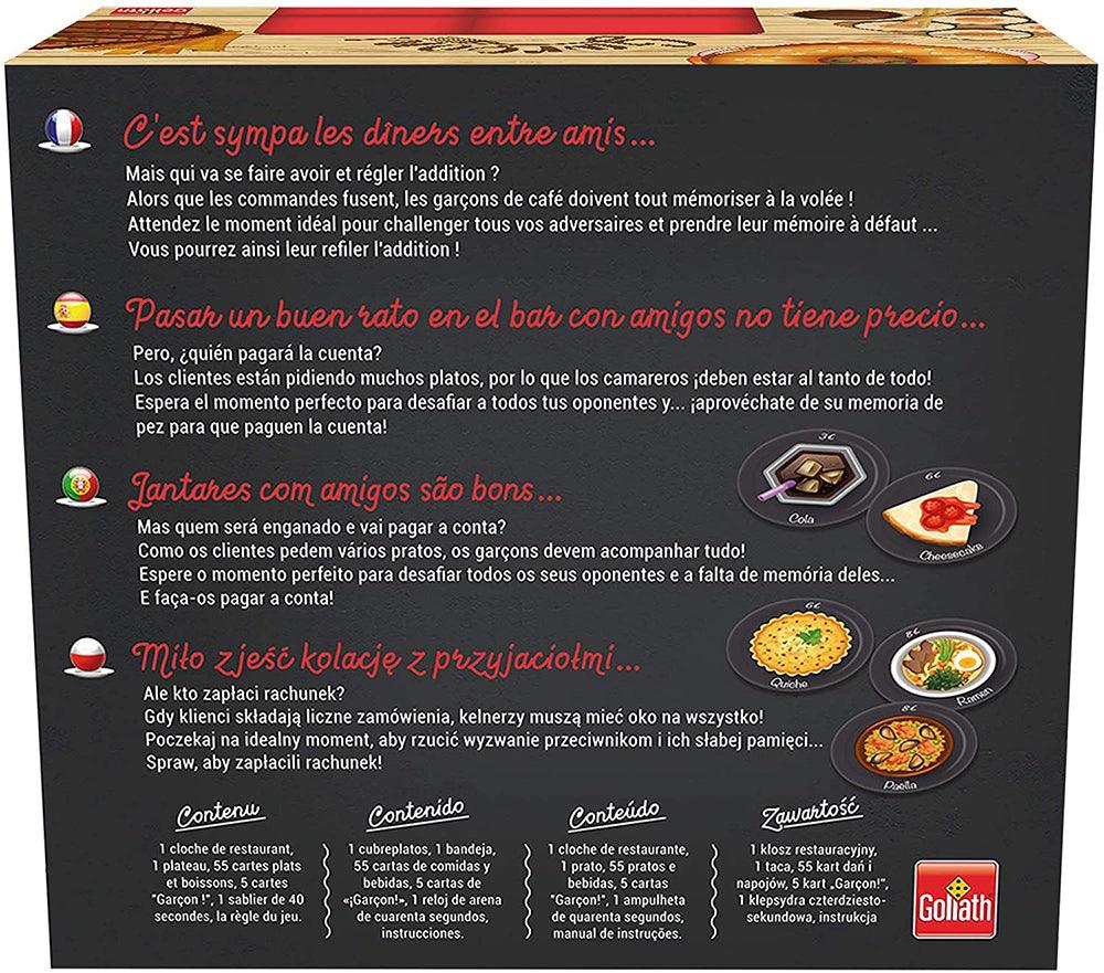 - Comprend : 55 cartes recettes, 5 cartes ''Garçon!'', 1 cloche de restaurant, 1 plateau, 1 sablier, la règle du jeu.
