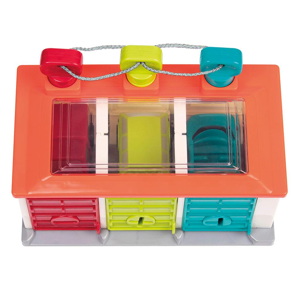 - La poignée rabattable te permet d'apporter ton jeu d'apprentissage de la causalité et des couleurs partout avec toi!