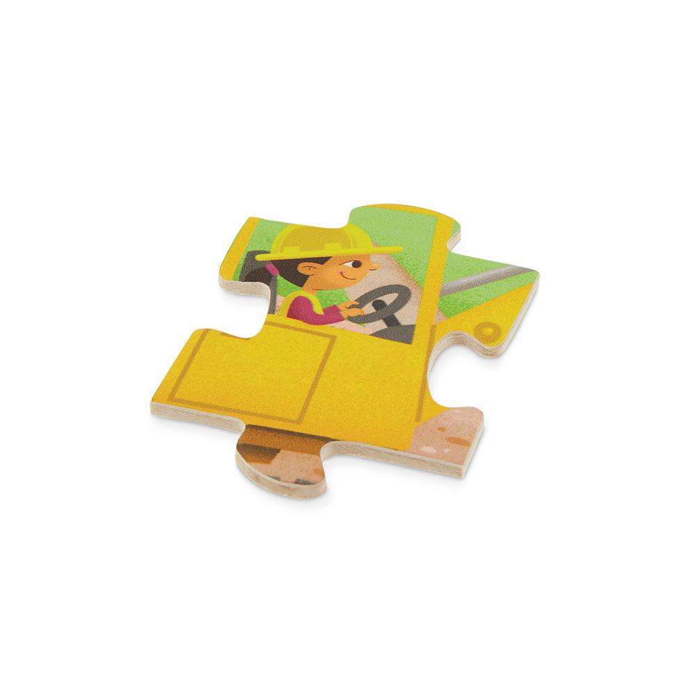 Ensemble de casse-têtes en bois, présentant 4 camions colorés : un porte-autos, une excavatrice, une chargeuse, un camion à benne.