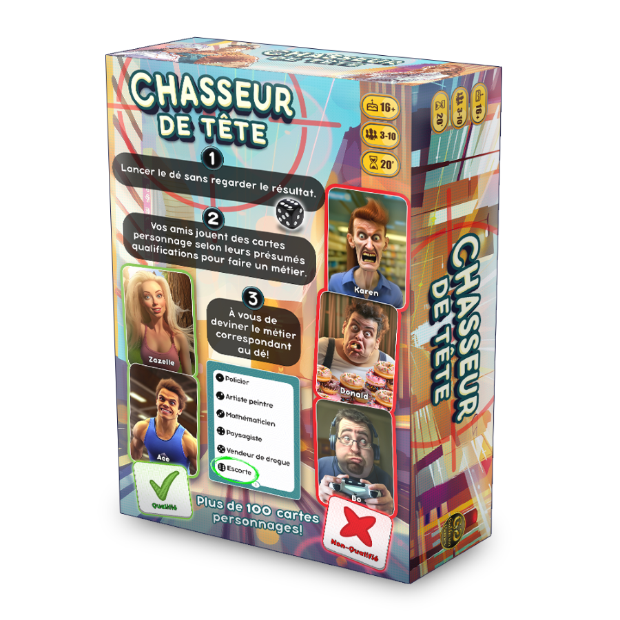 De façon coopérative, faites découvrir des métiers à vos amis en utilisant des cartes Personnages. Tenter de faire une bonne lecture des indices pour deviner 7 métiers et gagner la partie!