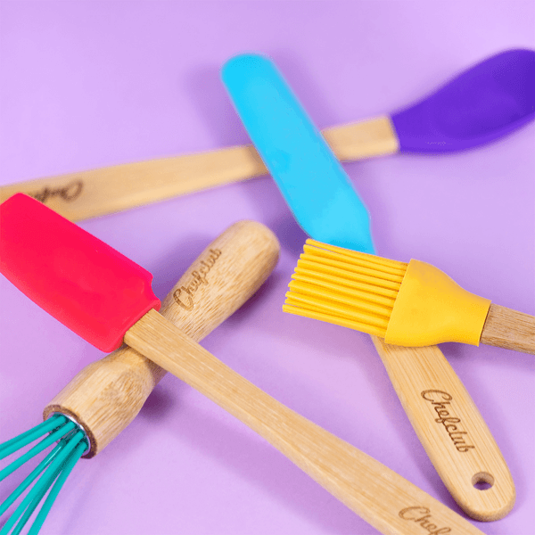 Découvrez les mini-ustensiles, adaptés aux enfants et aux couleurs de la brigade Chefclub, co-créés avec la communauté Chefclub ! L'attirail complet pour votre petit chef est dans ce kit : fouet, spatule, maryse, pinceau et cuillère.