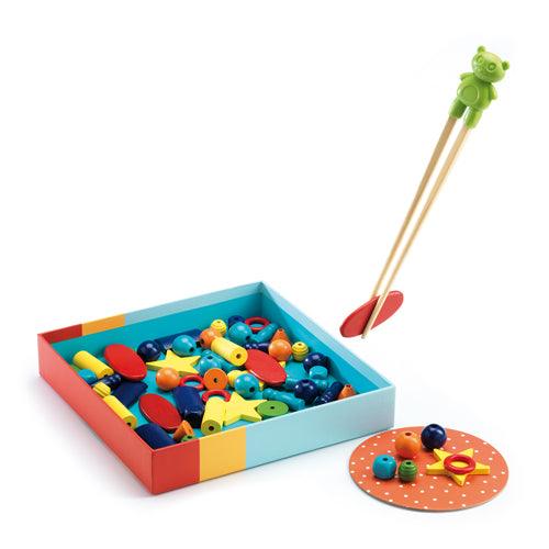 D'abord chacun se précipite pour attraper les bonnes perles... avec les baguettes ! Puis très délicatement, il faut construire son totem... sans qu'il ne tombe! Adresse et précipitation ! Il faudra rester Zen!
