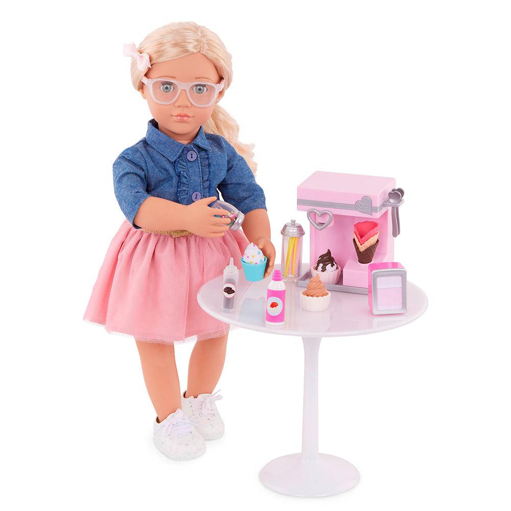 Découvrez le plaisir des glaces avec cet ensemble de machine à sundae de luxe ''Sundae Fun Day''. Le set comprend une machine à sundae, 2 cuillères, des gobelets, des cornets sucrés et 3 boules de crème glacée molle pour créer des délices glacés. Les accessoires supplémentaires tels que les gobelets, les pailles, les bonbons décoratifs, le sirop de chocolat, la crème fouettée et la distributrice de serviettes en papier ajoutent une touche réaliste à l'heure de la glace. Laissez libre cours à votre créativité et concoctez de délicieux desserts glacés pour vos poupées.