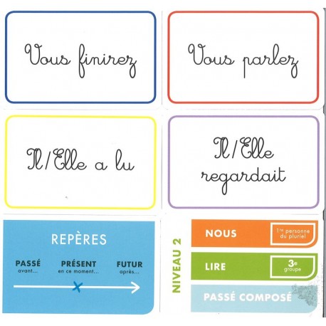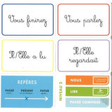 110 cartes pour s'entraîner aux conjugaisons du programme de CP, CE1 et CE2. Au recto des cartes on a le niveau (1 ou 2) et les indications sur le pronom personnel du verbe, le verbe à l'infinitif et le temps associé qu'il faut trouver. La réponse est au verso. L'objectif est de trouver la bonne réponse soit en jeu collectif, soit seul ou accompagné par un adulte. Le niveau 1 concerne les verbes conjugués au présent de l'indicatif, le niveau 2 au passé composé, imparfait et futur de l'indicatif. Un jeu simple et efficace, facilement modulable, pour apprendre et réviser les conjugaisons de base de manière ludique.