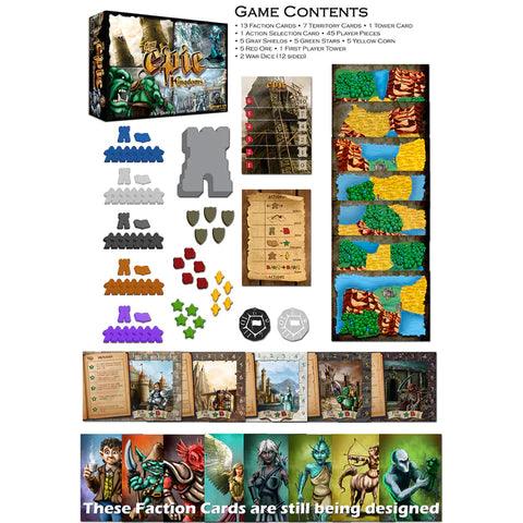Dans Tiny Epic Kingdoms, un jeu fantastique 4x dans un format de poche, chaque joueur commence avec une faction unique (qui possède un arbre technologique unique) et un petit territoire. Tout au long du jeu, les joueurs collectent des ressources, explorent d'autres territoires, s'affrontent, recherchent de la magie et travaillent à la construction d'une grande tour pour protéger leur royaume.
