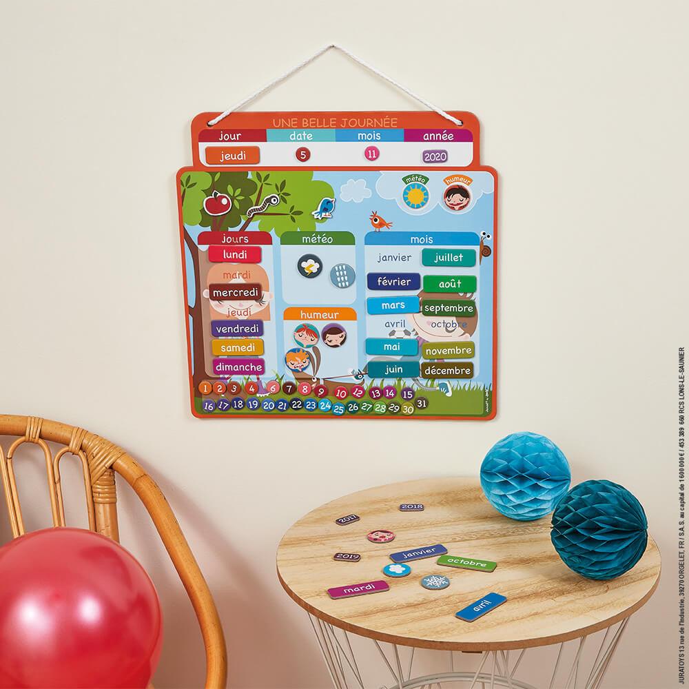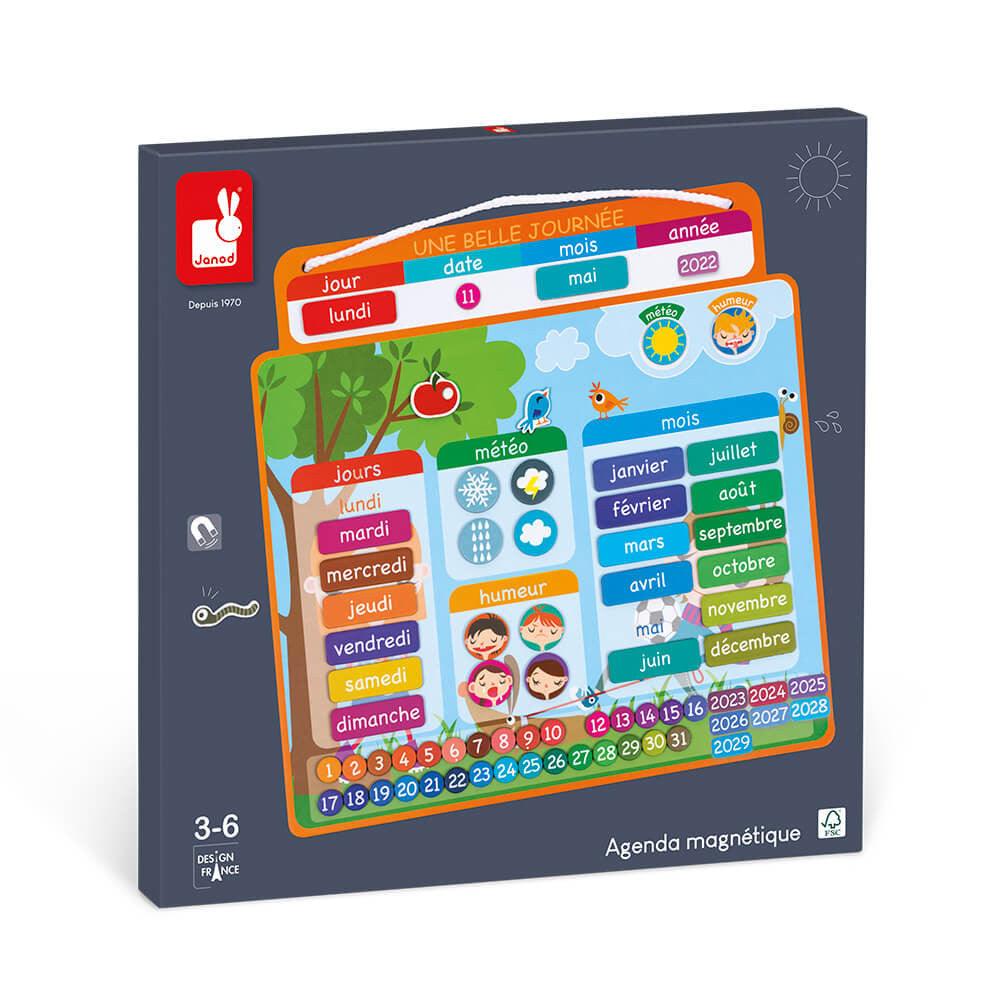 Maman, quel jour de la semaine sommes-nous ? Papa, est-ce qu'on est toujours en mars ? Explorer le temps et ses saisons devient un plaisir avec cet agenda magnétique 'Une belle journée'.
