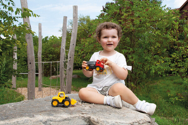 Chargeuse Workies de Lena en plastique ABS, avec essieux en acier galvanisé et pneus caoutchoutés de qualité supérieure, de sorte que votre enfant devient un fier conducteur de pelleteuse de manière ludique.
