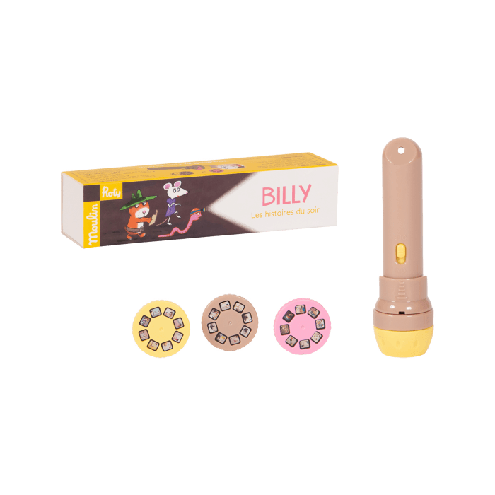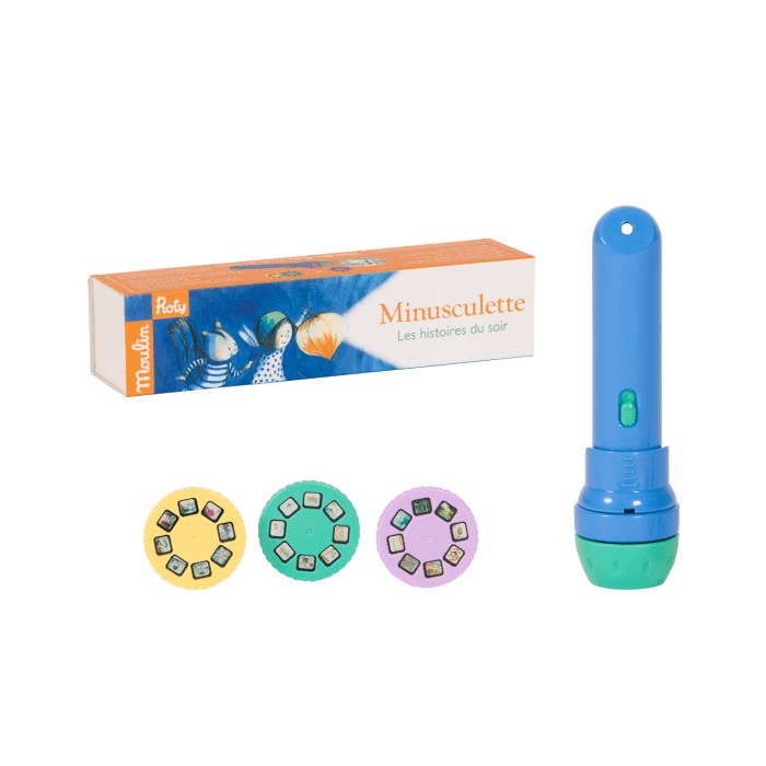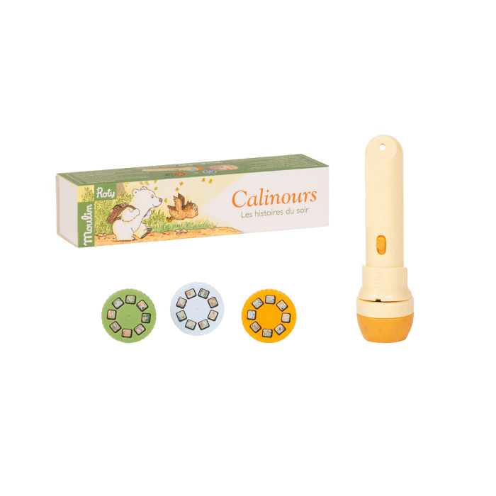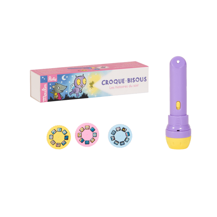 Lampe torche de poche où chacun des 3 disques projetés sur le mur raconte les aventures de Croque-Bisous, héros de l'école des loisirs. Pour endormir les tout-petits et développer leur imagination !
