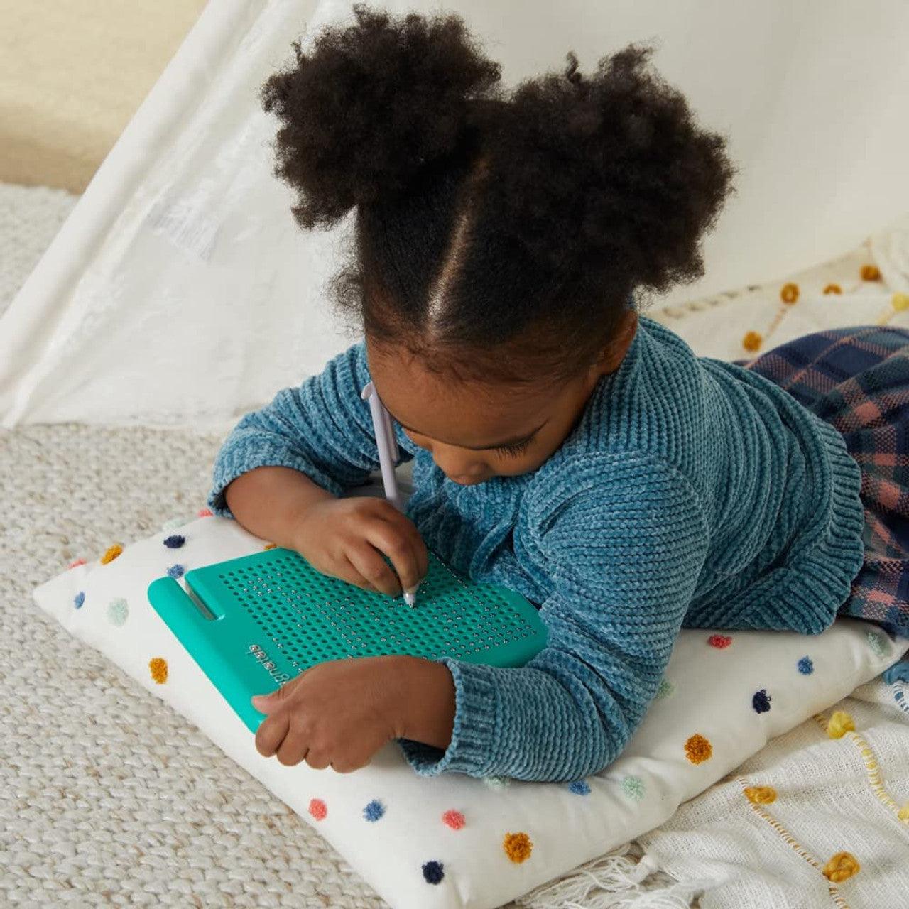 Le Magnatab original a été conçu en tenant compte du style d'apprentissage Montessori, créant une expérience de jeu créatif basée sur les sens. À l'aide du stylet magnétique, les enfants tirent les billes vers la surface pour dessiner des images, des lettres, des chiffres et des formes. Ce faisant, ils sentent l'attraction des aimants, entendent leur cliquetis et voient ce qu'ils dessinent. Les billes s'effacent comme par magie lorsqu'elles sont poussées vers le bas par le bout d'un doigt ou par le glissement du côté du stylet. La tablette permet de ranger facilement le stylet magnétique, qui s'enclenche en toute sécurité. Idéal pour une utilisation à la maison ou en classe ! Dimensions : 6″ × 7.5″ × .75″.