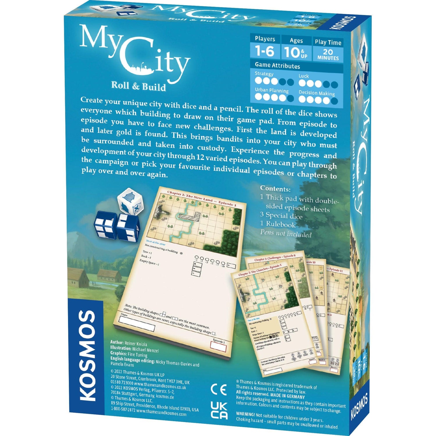 Créez votre ville unique avec des dés et un crayon. Le jet de dé indique à chacun quel bâtiment dessiner sur sa manette. D'épisode en épisode, vous devez faire face à de nouveaux défis. D'abord la terre est développée et plus tard l'or est trouvé. Cela amène des bandits dans votre ville qui doivent être encerclés et placés en garde à vue. Découvrez les progrès et le développement de votre ville à travers 12 épisodes variés. Vous pouvez jouer à travers la campagne ou choisir vos épisodes ou chapitres individuels préférés pour jouer encore et encore.