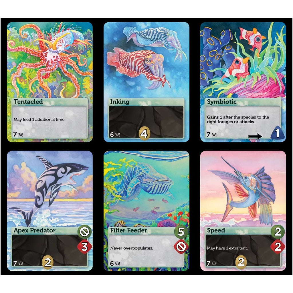 Oceans est un jeu de stratégie pour 2 à 6 joueurs de la série Evolution dans lequel vous créez un réseau dynamique de vie marine à travers des millions d'années d'évolution.